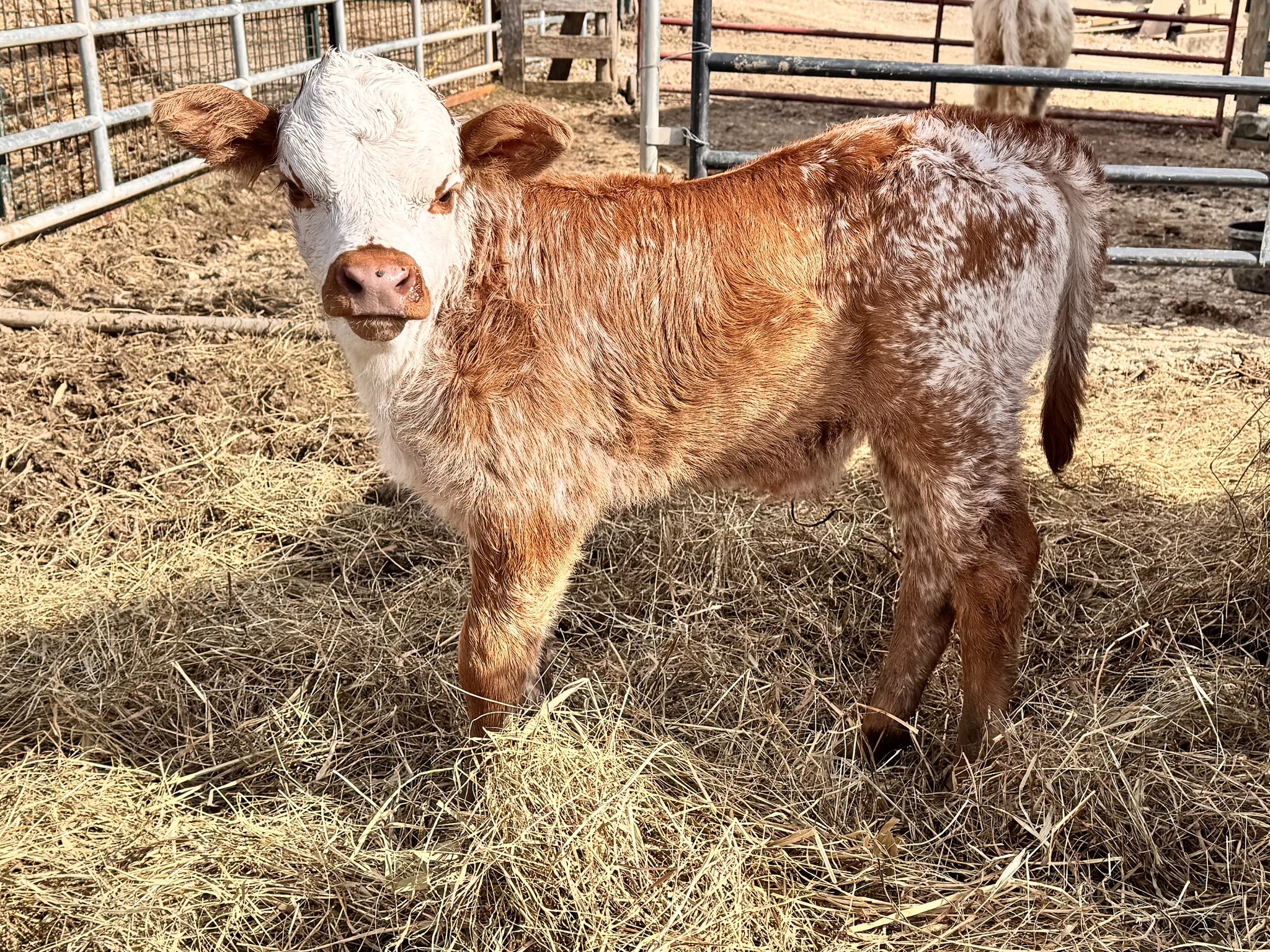 Beautiful Red and White speckled stout little bull calf. Drag Iron heavy