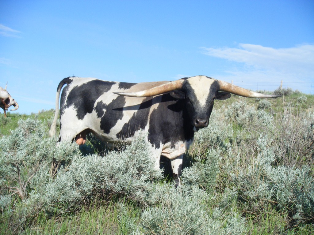 Saddlehorn is a very flashy bull with extremely flat lean back horn. 86 1/4 on 6-16-17. Tested by University of California,Davis Laboratory to be Homozygous Black. All his calves will be from the black family, he cannot produce red. Is a consistent producer of blue and black and white paint calves. Now AI Certified. Semen for sale at 75.00 per straw.